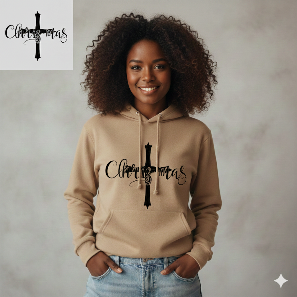 The image features a person wearing a stylish white hoodie with a prominent design. The design includes the word "Christmas" elegantly scripted across a central cross. This combination highlights the festive spirit of the holiday while emphasizing its Christian foundations. The overall look is casual yet meaningful, making the shirt perfect for holiday gatherings or celebrations. The simplicity of the tan hoodie enhances the bold black lettering, creating a striking visual appeal.